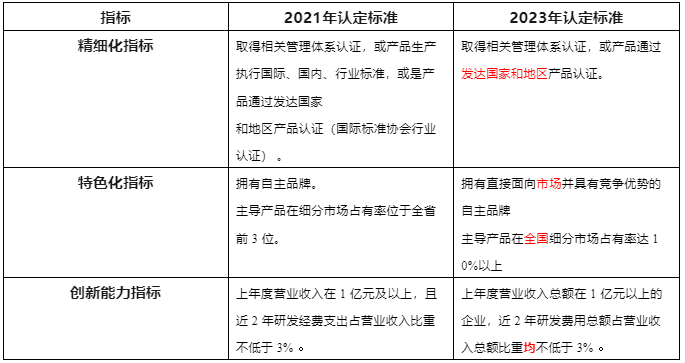2021 VS 2023專精特新“小巨人” 企業認定標準變化對比