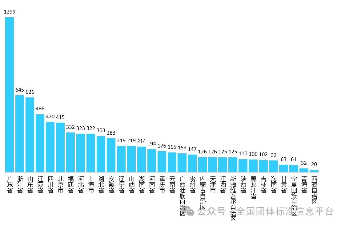 截至2024630日,廣東省、浙江省、山東省、江蘇省等31個省、自治區、直轄市的社會團體在全國團體標準信息平臺注冊,其中廣東省社會團體注冊數最多,為1299家,占社會團體注冊總數的14.3%