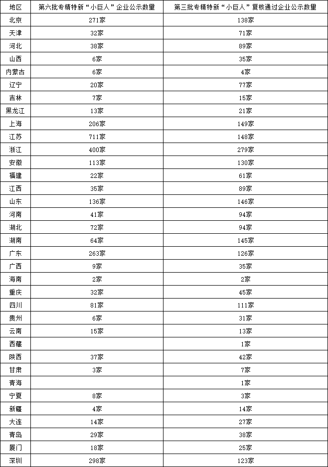 第六批專精特新企業(yè)的分布省市情況呈現(xiàn)出明顯的地域差異,經(jīng)濟(jì)大省的“小巨人”企業(yè)數(shù)量遙遙領(lǐng)先。在此次公示的第六批專精特新 “小巨人” 企業(yè)中,江蘇、廣東(含深圳)和浙江數(shù)量較多,分別有711家、561家和400家,三個省份“小巨人”企業(yè)數(shù)量占比超過一半。