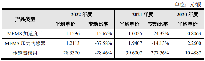 從市場的角度來看,以上產品中,MEMS加速度計單價呈上升趨勢,MEMS壓力傳感器和傳感器模組呈下降趨勢。該公司對單價上升的解釋為:主要系品牌客戶占比提高、產能緊缺背景下單價的上調所致。