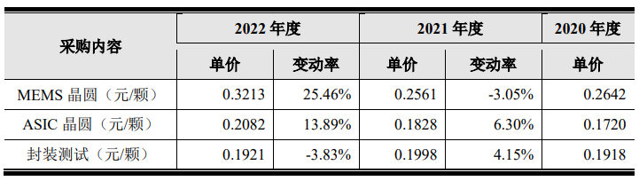 2020年度與2021年度,公司的原材料平均采購單價較為穩定。2022年度晶圓采購單價漲幅較大,主要原因系上游代工在產能緊張背景下提高了供貨價格,以及當年度單價較高的ASIC晶圓采購占比提高所致。另外,公司MEMS晶圓代工廠主要為臺積電和VIS,上述兩家代工廠均采用美元結算;2022年度,由于美元對人民幣匯率持續走高,一定程度上拉高了當年度晶圓采購單價。