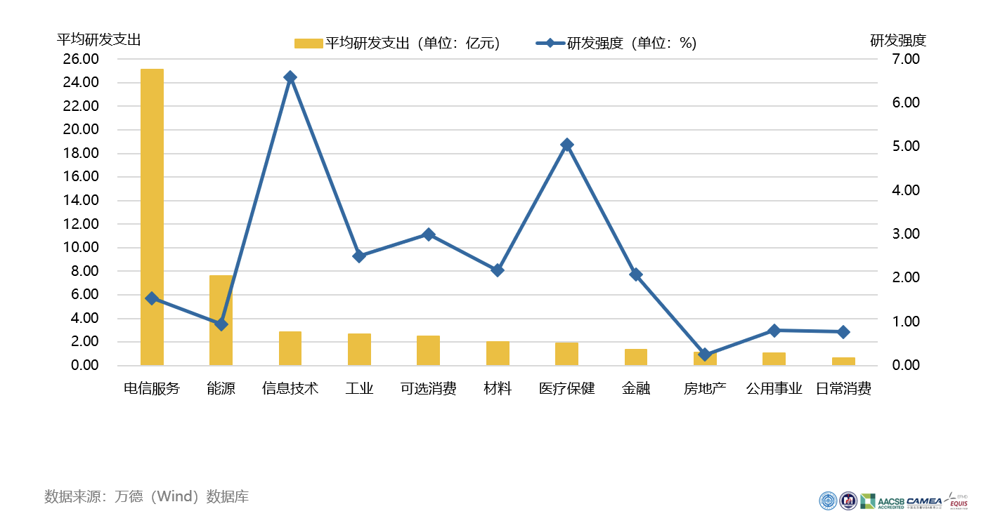 研發(fā)經(jīng)費(fèi)投入規(guī)模與強(qiáng)度的行業(yè)間差距懸殊。報(bào)告顯示,2020年工業(yè)行業(yè)境內(nèi)上市企業(yè)數(shù)量和研發(fā)經(jīng)費(fèi)總額都遠(yuǎn)超其他行業(yè),但平均研發(fā)經(jīng)費(fèi)投入規(guī)模只有2.67億元,遠(yuǎn)低于電信服務(wù)行業(yè)的平均規(guī)模25.16億元,側(cè)面反映工業(yè)行業(yè)的技術(shù)需求小于電信服務(wù)行業(yè)。2020年,信息技術(shù)行業(yè)平均研發(fā)強(qiáng)度達(dá)到了6.60%,房地產(chǎn)、日常消費(fèi)、公用事業(yè)和能源行業(yè)等平均研發(fā)強(qiáng)度仍低于1.00%。