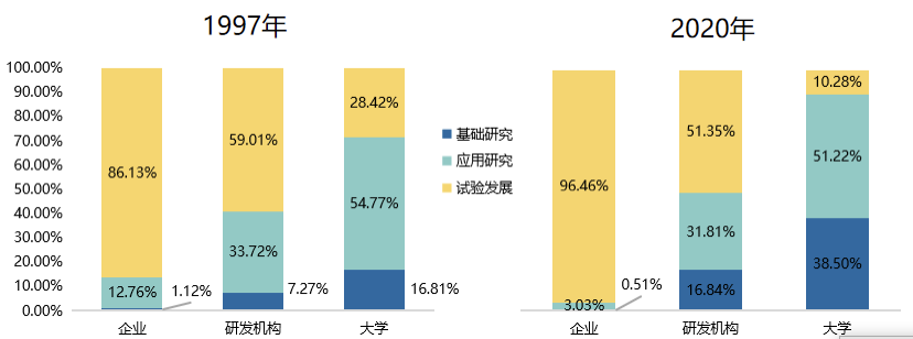 圖12 中國(guó)研發(fā)經(jīng)費(fèi)執(zhí)行主體的研發(fā)類型結(jié)構(gòu)(1997-2020年)
