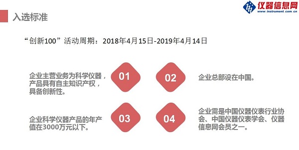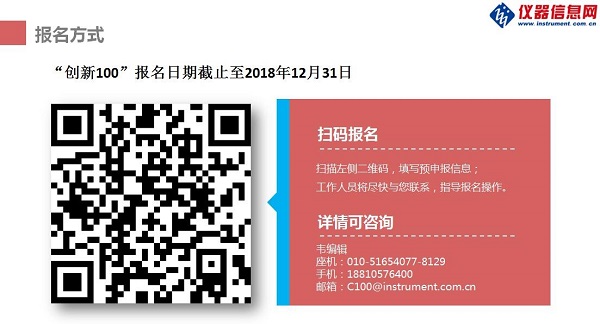 后續(xù),“創(chuàng)新 100”還將繼續(xù)走訪報道北京、天津、深圳、福建、江浙滬等地的儀器廠商,通過篩選“科學(xué)儀器行業(yè)最具成長潛力企業(yè)”、撰寫中小儀器企業(yè)創(chuàng)新能力調(diào)研報告等形式,依托儀器信息網(wǎng)媒體資源,形成“創(chuàng)新 100”企業(yè)傳播的倍增效應(yīng)。“創(chuàng)新 100”申報截止至 2018 年 12 月 31 日,歡迎符合如下條件的儀器企業(yè)積極申報。