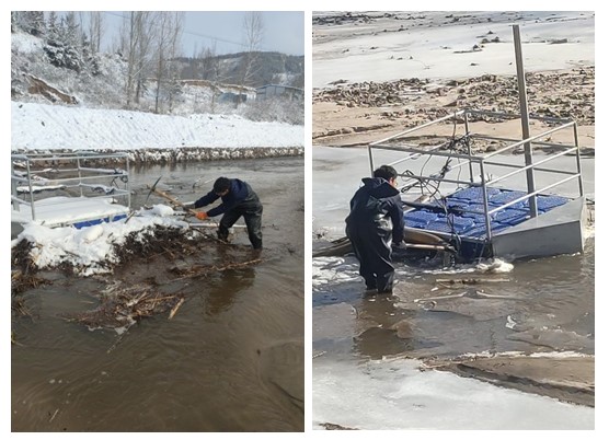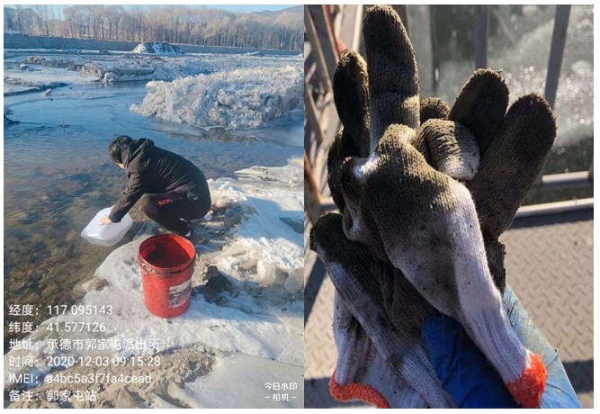 河北省承德市郭家屯、李臺(tái)站運(yùn)維人員黃可新、高凌立對(duì)水站進(jìn)行巡檢時(shí),發(fā)現(xiàn)采水口附近堆積了大量樹枝雜物,他們毫不猶豫,穿著水褲下入河水,刨開冰雪清理雜物。雖然腳下的河水冰冷,但是他們的熱情高漲,保證數(shù)據(jù)“真、準(zhǔn)、全”,他們認(rèn)為一切都是值得的。