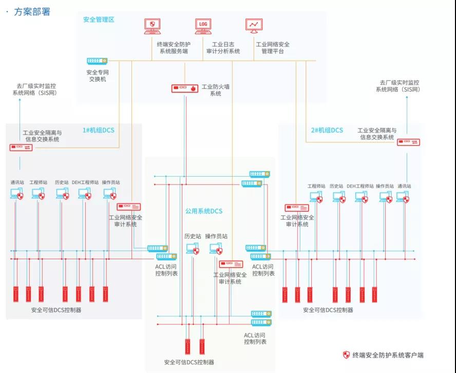 和利時(shí)典型火電控制系統(tǒng)網(wǎng)絡(luò)安全解決方案,遵照等保2.0與能源局36號(hào)文等政策法規(guī)要求,遵循“安全分區(qū)、網(wǎng)絡(luò)專用、橫向隔離、縱向保證”防御體系,針對(duì)火電廠監(jiān)控系統(tǒng)進(jìn)行安全防護(hù)設(shè)計(jì)。對(duì)火電廠監(jiān)控系統(tǒng)進(jìn)行合理的區(qū)域劃分,通過防護(hù)方案使火電廠生產(chǎn)監(jiān)控系統(tǒng)具有抵御黑客、病毒、惡意代碼等網(wǎng)絡(luò)與應(yīng)用系統(tǒng)的破壞和攻擊,阻止內(nèi)部人員的非法訪問,抵御外部攻擊,在遭受攻擊和破壞后能及時(shí)恢復(fù)系統(tǒng)的能力,確保關(guān)鍵業(yè)務(wù)數(shù)據(jù)的可用性、機(jī)密性、完整性。