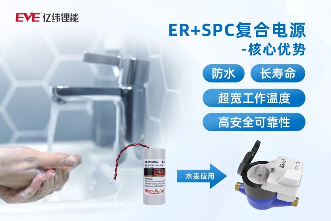 億緯鋰能擁有智能水表全系列解決方案,包括ER、CR、ES復(fù)合電源,其中,由億緯鋰能自主創(chuàng)新研發(fā)的ES復(fù)合電源方案,兼顧了鋰亞電池長壽命、電池電容器輸出大脈沖的優(yōu)勢,有效地保障水表更穩(wěn)定、精確、長壽命運行,且采用獨特的電池組灌膠工藝,可以滿足水浸場景應(yīng)用。