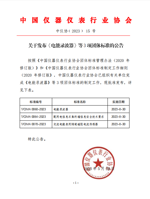 關(guān)于發(fā)布《電能錄波器》等3項團(tuán)體標(biāo)準(zhǔn)的公告
