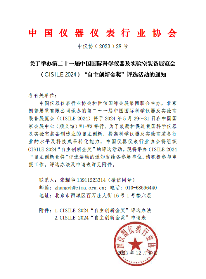 中國儀器儀表行業(yè)協(xié)會和世信國際會展集團聯(lián)合主辦,北京朗普展覽有限公司承辦的第二十一屆中國國際科學(xué)儀器及實驗室裝備展覽會(CISILE 2024)將于2024年5月29~31日在中國國家會展中心(順義館)W1-W3舉行。為了鼓勵和促進我國科學(xué)儀器及實驗室裝備制造業(yè)的自主創(chuàng)新,提高科學(xué)儀器及實驗室裝備行業(yè)的水平及科技成果轉(zhuǎn)化能力,中國儀器儀表行業(yè)協(xié)會將組織CISILE 2024“自主創(chuàng)新金獎”的評選活動。現(xiàn)將舉辦CISILE 2024“自主創(chuàng)新金獎”評選活動的通知發(fā)給各參展單位,請積極參與申報工作。評選辦法及申請表詳見附件。