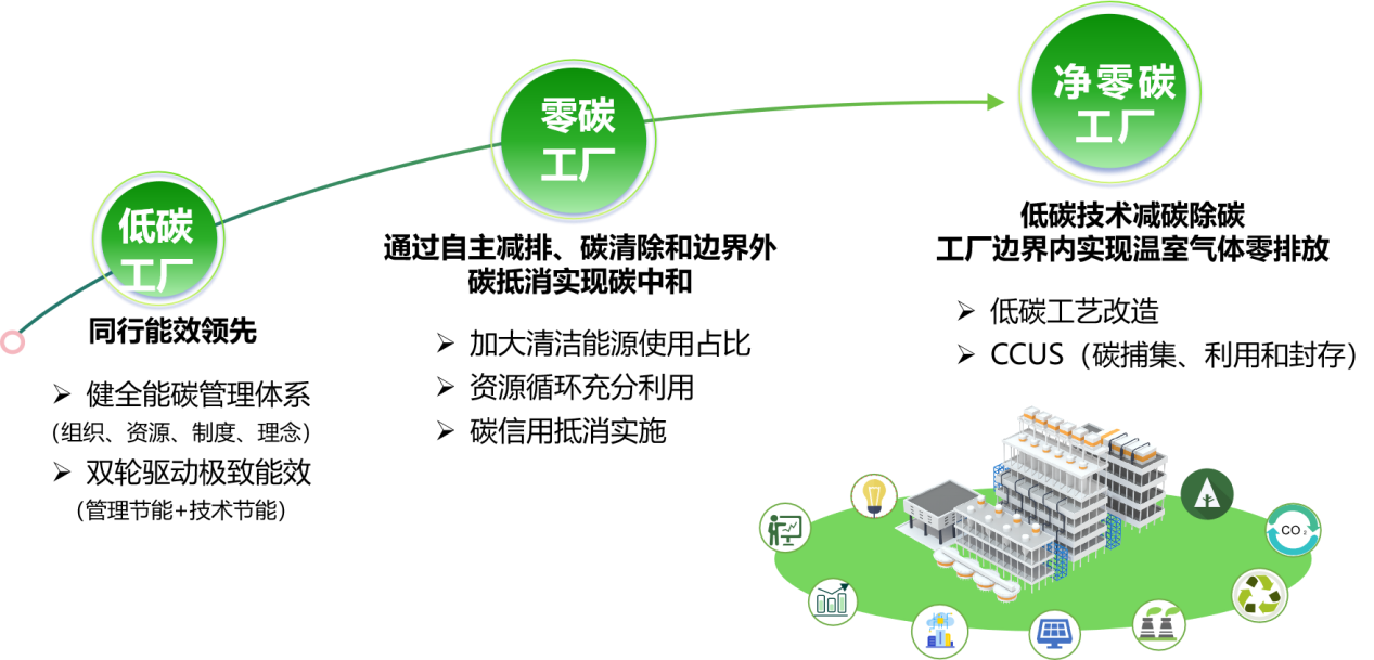 PhaseⅡ—零碳工廠:在低碳工廠的基礎(chǔ)上進(jìn)一步通過能源結(jié)構(gòu)調(diào)整、資源循環(huán)利用、碳清除、碳抵消等方式實(shí)現(xiàn)整體對外溫室氣體排放為零。