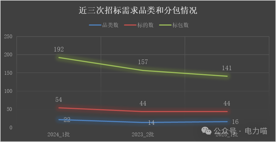 本次招標主要需求包含22個品類、54個標的、192個標包。本次招標新增的物資品類主要是中壓開關自動化成套柜小類增加安全可控品類產(chǎn)品。