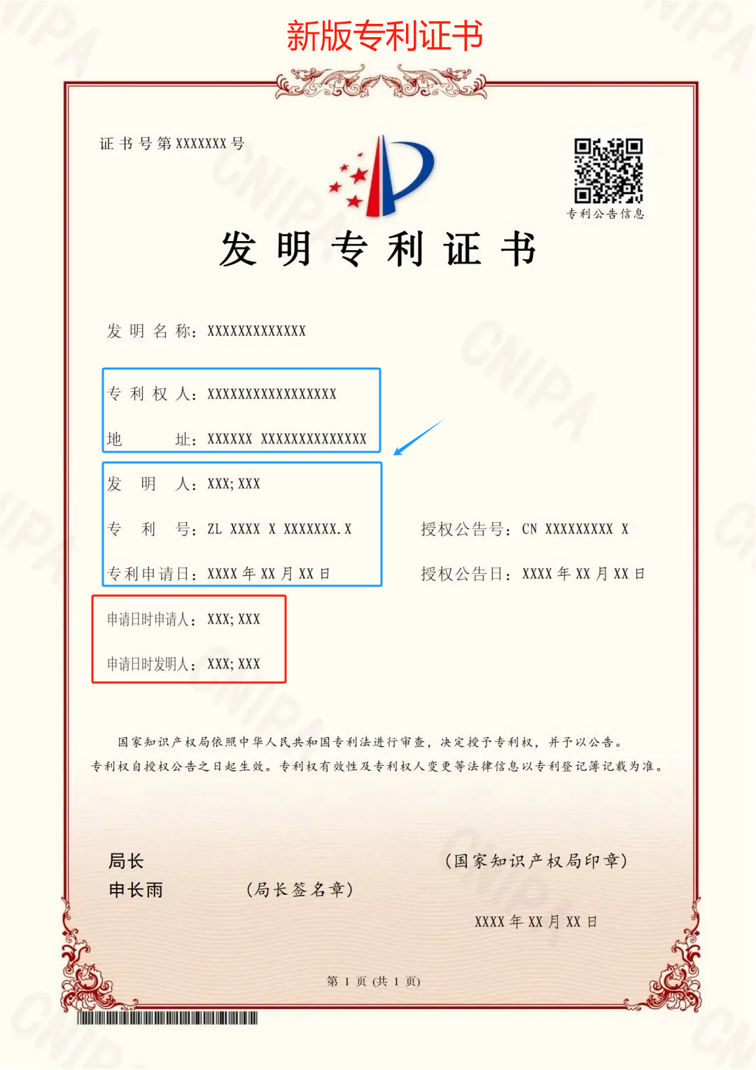 對(duì)于授權(quán)公告日在2024年6月1日之后(含當(dāng)日)的專利,國(guó)家知識(shí)產(chǎn)權(quán)局頒發(fā)新版專利證書(shū)。新版專利證書(shū)沿用A4規(guī)格豎排版式,優(yōu)化調(diào)整著錄事項(xiàng)布局。