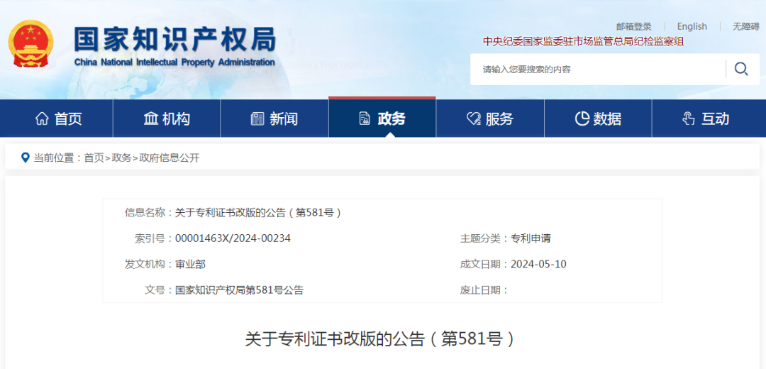 關(guān)于專利證書(shū)改版的公告(第581號(hào))