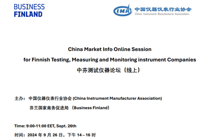 2024年9月26日,由中國(guó)儀器儀表行業(yè)協(xié)會(huì)(CIMA)和芬蘭國(guó)家商務(wù)促進(jìn)局(Business Finland)聯(lián)合主辦的中芬測(cè)試儀器論壇(線上)成功舉行。本次論壇旨在促進(jìn)中、芬兩國(guó)在測(cè)試、測(cè)量和監(jiān)測(cè)儀器領(lǐng)域的交流與合作,吸引了中、芬多家企業(yè)代表的參與。
