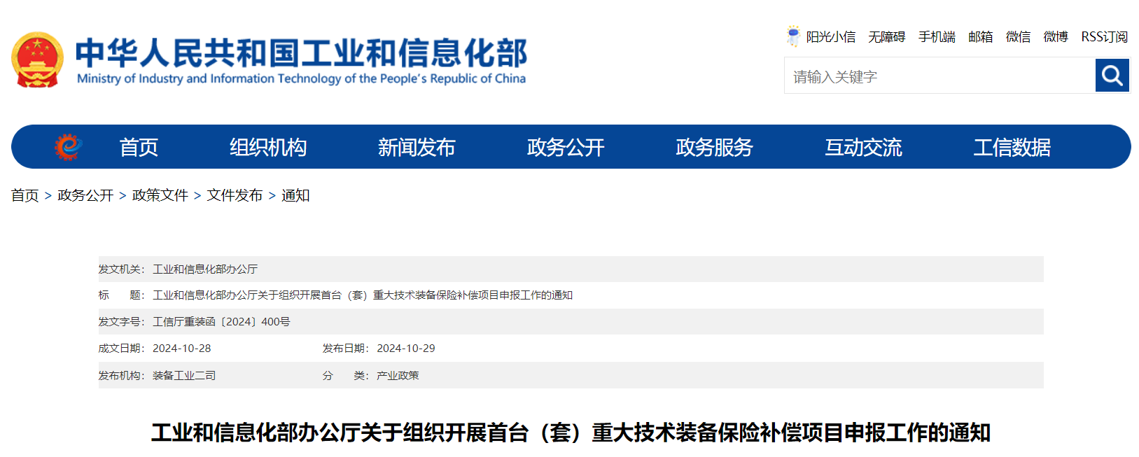 根據首臺(套)重大技術裝備保險補償政策安排,現組織開展2024年保險補償項目申報工作,審核首臺(套)重大技術裝備保險補償資格。有關事項通知如下: