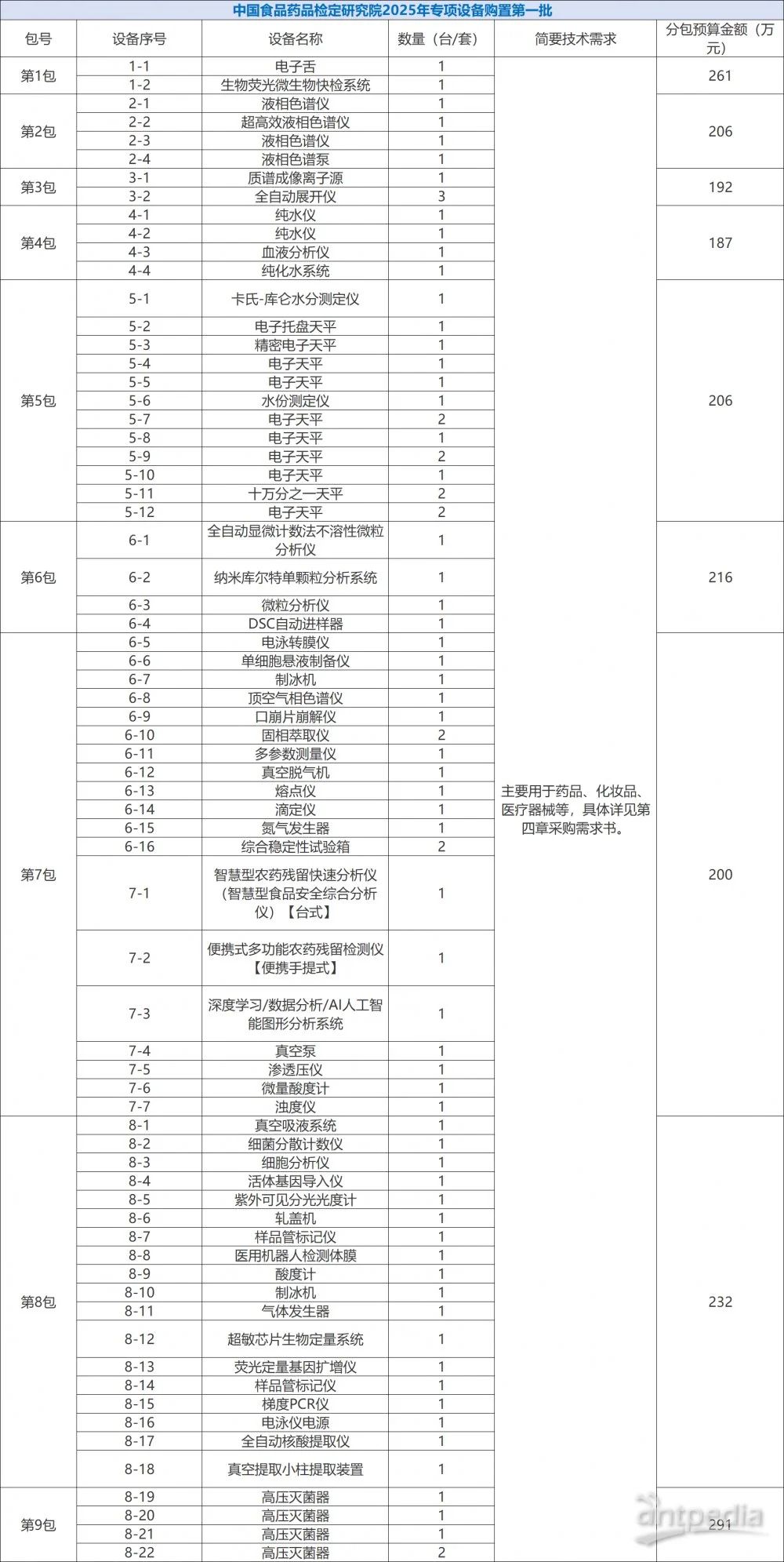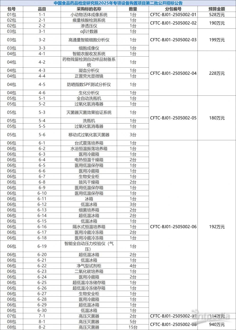 中國政府采購網(wǎng)消息,近日,中國食品藥品檢定研究院就2025年專項(xiàng)設(shè)備購置項(xiàng)目分別于6月24日和7月4日發(fā)布招標(biāo)公告,招標(biāo)總金額為6212萬元,采購的儀器設(shè)備共計(jì)605臺/套,包括超高效液相色譜儀、生物熒光微生物快檢系統(tǒng)、小動物活體成像系統(tǒng)等。