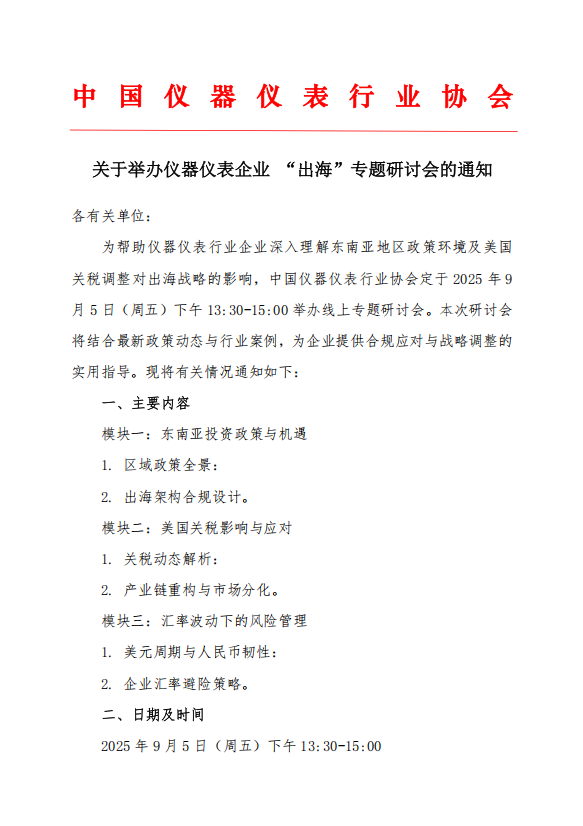 關(guān)于舉辦儀器儀表企業(yè) “出海”專(zhuān)題研討會(huì)的通知