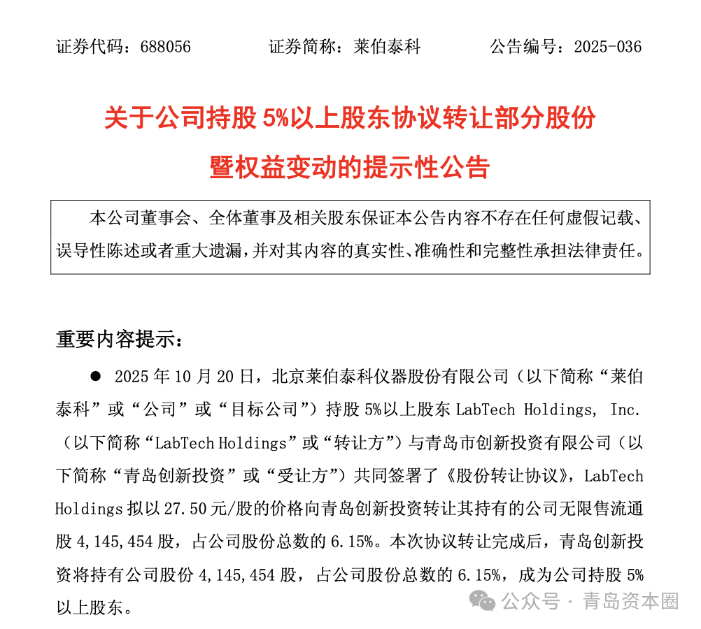 10月21日,北京萊伯泰科儀器股份有限公司(股票代碼:688056,簡稱 “萊伯泰科”)發(fā)布公告稱,公司股東LabTech Holdings, Inc.(以下簡稱 “LabTech Holdings” )與青島市創(chuàng)新投資有限公司共同簽署了《股份轉讓協(xié)議》,LabTech Holdings擬以27.50元/股的價格向青島創(chuàng)新投資轉讓其持有的公司無限售流通股414.55萬股,占公司股份總數的 6.15%。本次協(xié)議轉讓完成后,青島創(chuàng)新投資將持有公司股份414.55萬股,占公司股份總數的6.15%,成為公司持股5%以上股東。