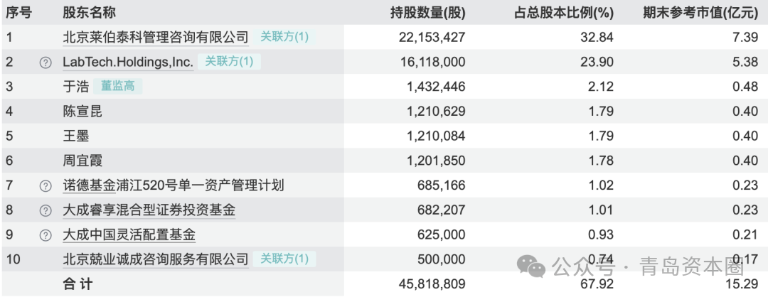 截至 2025 年半年度報告期末,萊伯泰科股東總數為3635戶。從主要股東來看,北京萊伯泰科管理咨詢有限公司為公司控股股東,持股數量 2215.34 萬股,持股比例 32.84%;LabTech Holdings, Inc. 為第二大股東,持股 1611.80 萬股,持股比例 23.90%;此外,于浩、陳宣昆、王墨等自然人股東及諾德基金、大成基金等機構股東也持有一定比例股份。青島市創(chuàng)新投資有限公司本次戰(zhàn)略入股后,將成為公司第三大股東。