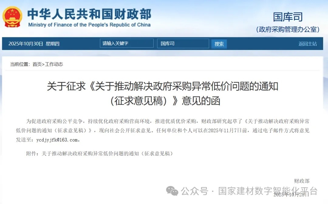 10月28日,財(cái)政部發(fā)布關(guān)于征求《關(guān)于推動(dòng)解決政府采購(gòu)異常低價(jià)問題的通知(征求意見稿)》意見的函。