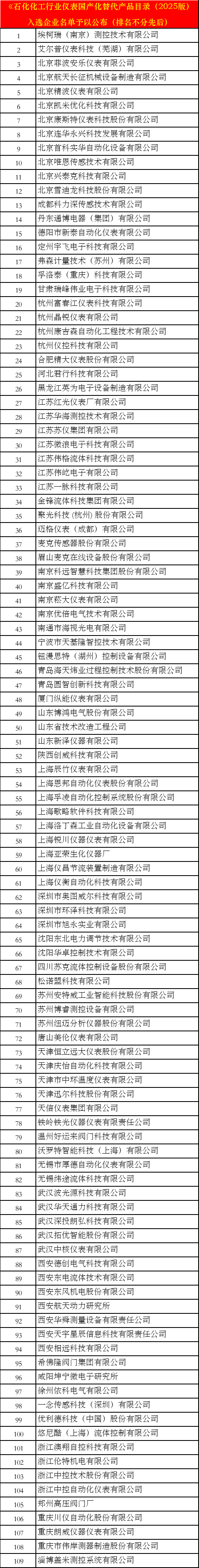 為貫徹落實國家關鍵裝備自主可控戰略部署,推動石化化工行業高質量發展,加速石化、化工、煤化工、精細化工等領域自動化儀表與控制系統國產化進程,提升產業鏈供應鏈安全穩定水平,樹立行業標桿典范。經公開征集、企業申報、資格審核、專家評審等環節,現將《石化化工行業儀表國產化替代產品目錄(2025版)》入選企業名單予以公布(排名不分先后)。