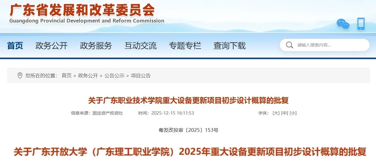 12月15日,廣東省發(fā)展和改革委員會連續(xù)發(fā)布兩項批復——“關(guān)于廣東職業(yè)技術(shù)學院重大設(shè)備更新項目初步設(shè)計概算的批復”以及“關(guān)于廣東開放大學(廣東理工職業(yè)學院)2025年重大設(shè)備更新項目初步設(shè)計概算的批復”。根據(jù)批復,兩所院校擬更新購置共142臺(套)教學科研儀器設(shè)備,總投資14930萬元。