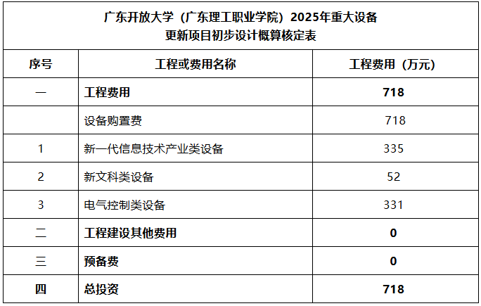 項目概算總投資718萬元,均為設(shè)備購置費。項目建設(shè)資金由學校申請超長期特別國債及自籌解決。
