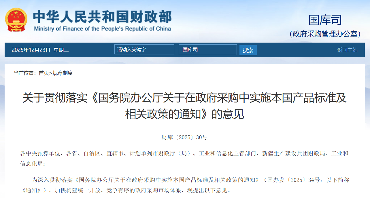 《意見》明確,要充分認識在政府采購中實施本國產品標準及相關政策的重要意義、全面理解在政府采購中實施本國產品標準及相關政策的內涵和要求,并抓好貫徹落實。