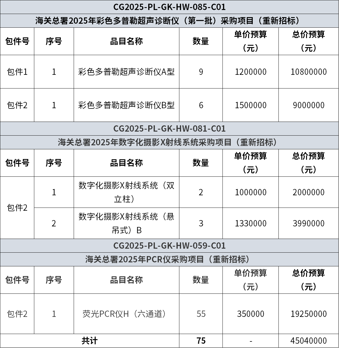 近日,海關總署物資裝備采購中心發布多則公告,分別就“海關總署2025年數字化攝影X射線系統采購項目(重新招標)”“海關總署2025PCR儀采購項目(重新招標)”“海關總署2025年彩色多普勒超聲診斷儀(第一批)采購項目(重新招標)”進行國內公開招標采購。
