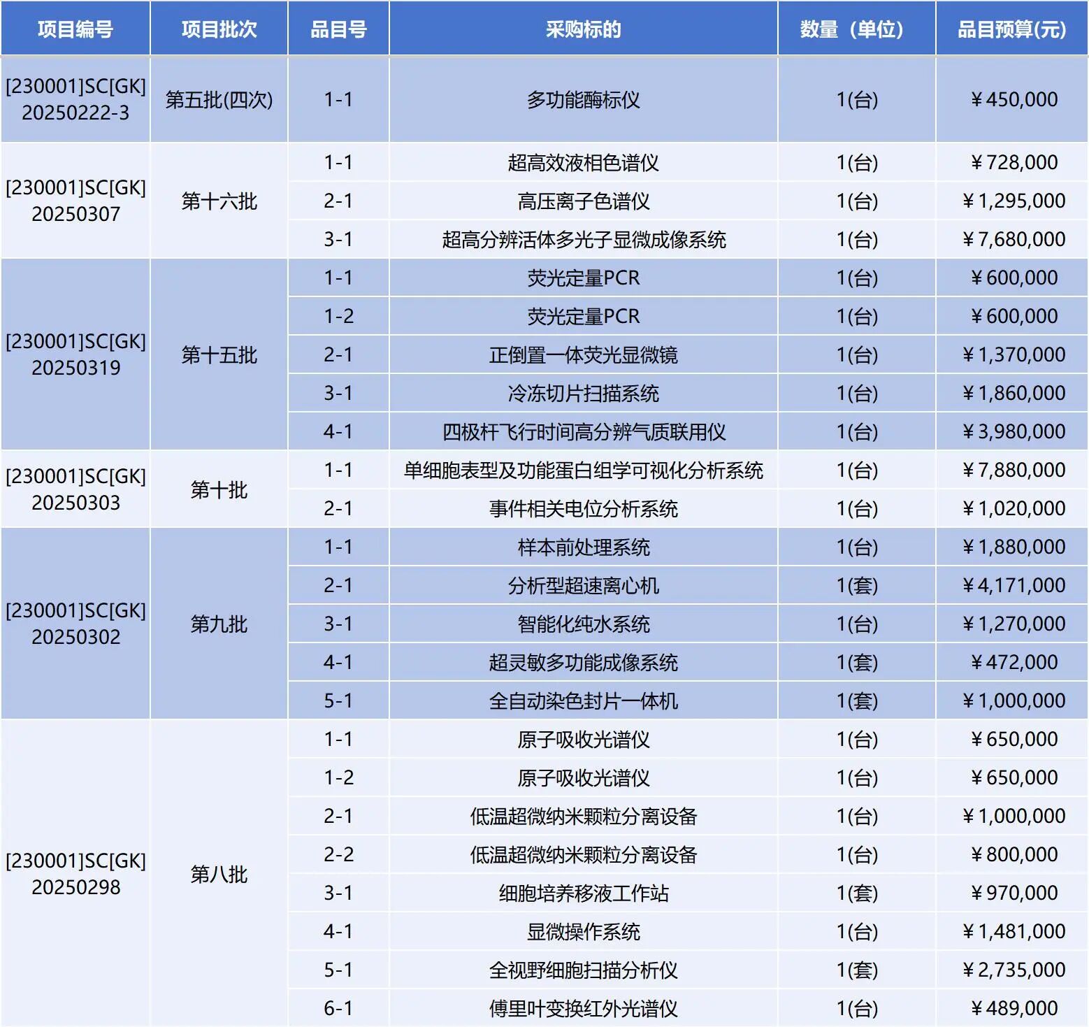 據(jù)統(tǒng)計(jì),本次計(jì)劃采購的儀器設(shè)備總預(yù)計(jì)招標(biāo)金額超過8200萬元,涵蓋四極桿飛行時(shí)間高分辨氣質(zhì)聯(lián)用儀、高效液相色譜儀、研究級(jí)倒置熒光顯微鏡、倒置多功能熒光成像系統(tǒng)、熒光定量PCR儀、高壓離子色譜儀、多功能酶標(biāo)儀、傅里葉變換紅外光譜儀、原子吸收光譜儀、超靈敏化學(xué)發(fā)光成像儀、超高頻高分辨率小動(dòng)物超聲成像系統(tǒng)、小動(dòng)物活體三維成像系統(tǒng)、超靈敏多功能成像系統(tǒng)、單細(xì)胞表型及功能蛋白組學(xué)可視化分析系統(tǒng)等共計(jì)40項(xiàng)高端科研設(shè)備。
