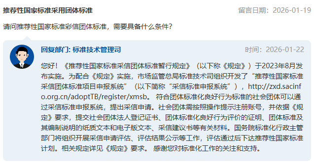近期,有網(wǎng)友在市場(chǎng)監(jiān)管總局網(wǎng)站公眾留言系統(tǒng)咨詢關(guān)于“國(guó)家標(biāo)準(zhǔn)引用、采用團(tuán)體標(biāo)準(zhǔn)”的問(wèn)題,市場(chǎng)監(jiān)管總局給予了答復(fù)。