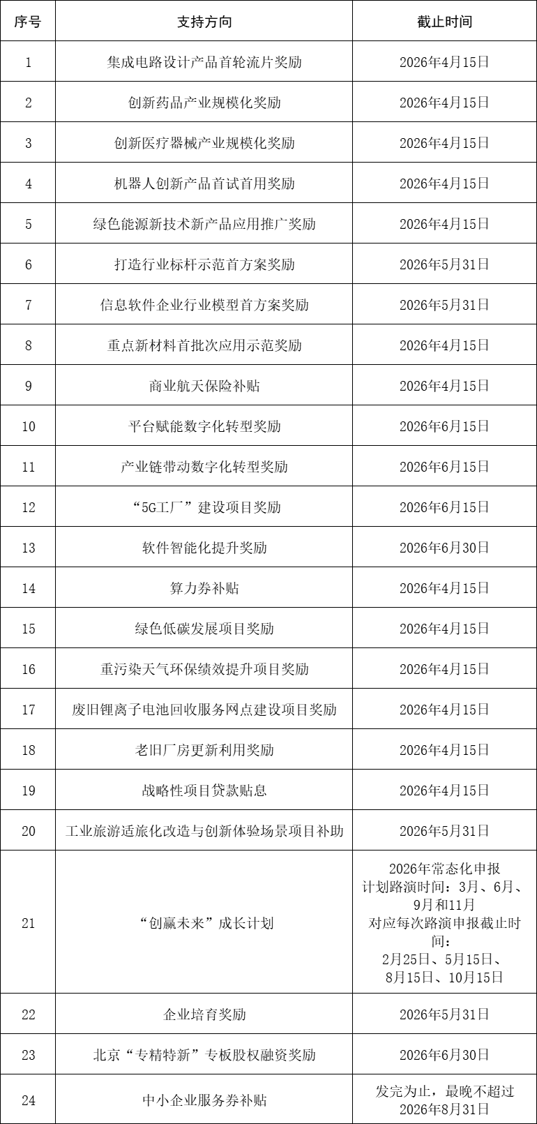 2.符合方向1-21、方向23條件的申報單位可在2026年3月4日至申報截止時間內登錄北京市人民政府門戶網站“政策兌現”頻道(https://zhengce.beijing.gov.cn),選擇相對應的項目,按照指引填報相關企業信息及對應材料。