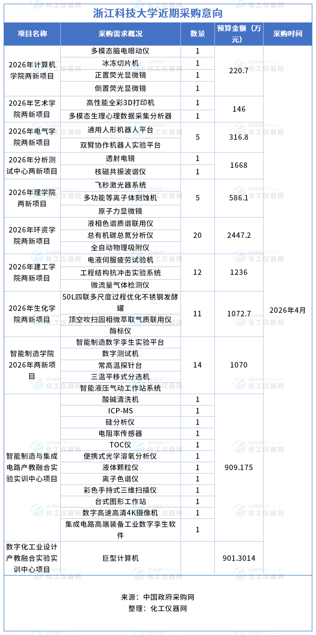 預(yù)算超1億!浙江科技大學(xué)發(fā)布4月儀器采購意向