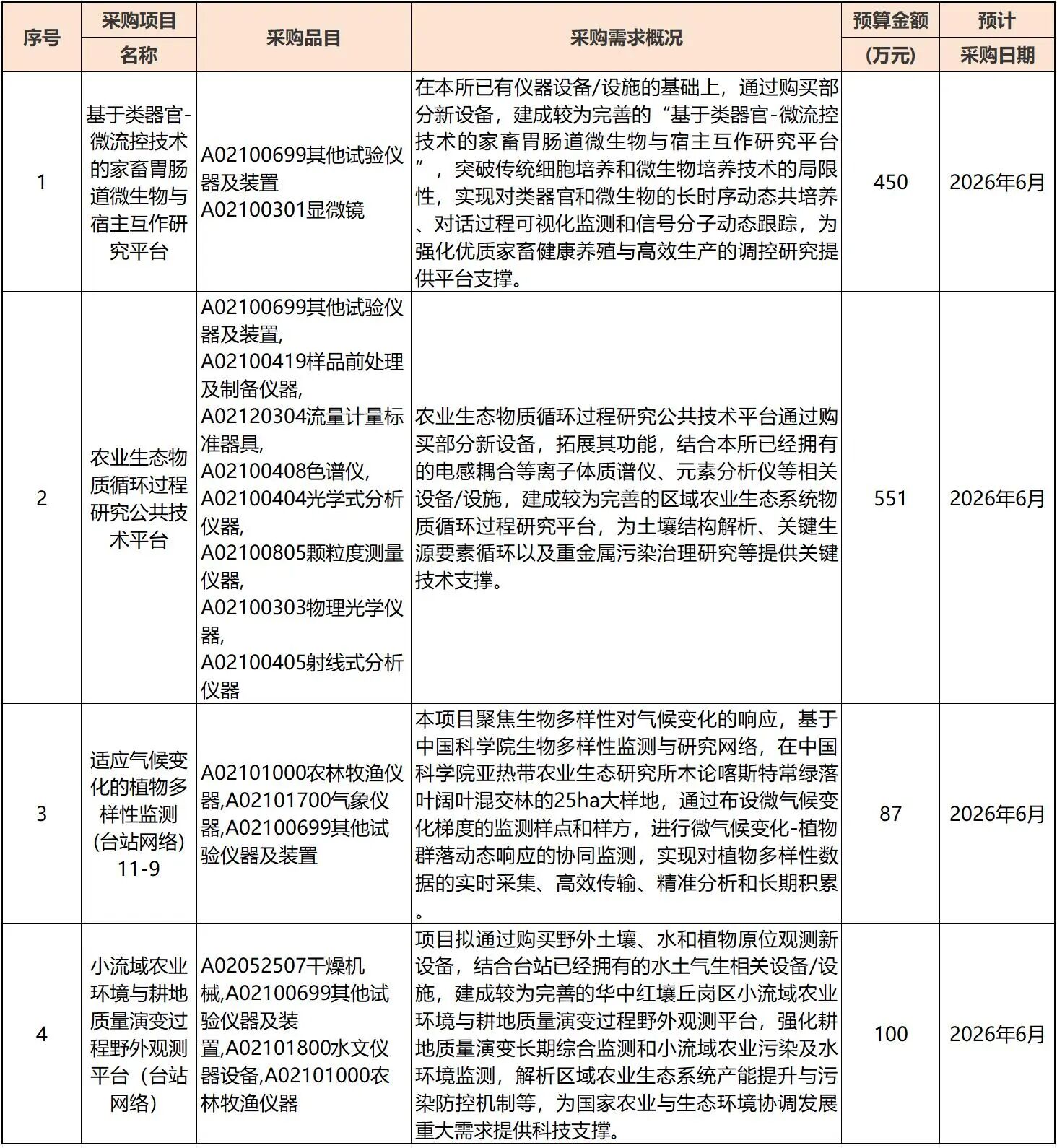 近日,中國科學院亞熱帶農業生態研究所發布2026年3至12月政府采購意向,計劃投入超千萬元集中采購一批尖端科研儀器設備。本次采購項目包括基于類器官-微流控技術的家畜胃腸道微生物與宿主互作研究平臺、農業生態物質循環過程研究公共技術平臺,植物多樣性監測儀器和小流域環境觀測平臺相關設備。