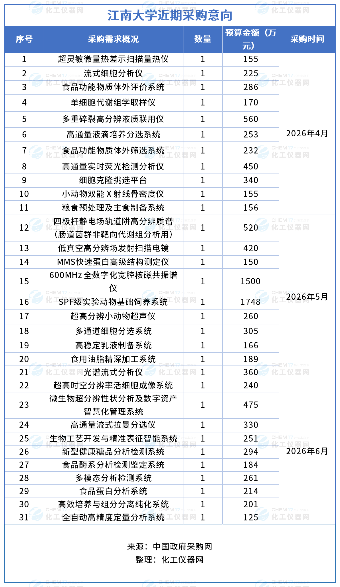近期,江南大學(xué)發(fā)布多項(xiàng)儀器采購意向,采購預(yù)算金額11175萬元,涉及儀器設(shè)備包括超靈敏微量熱差示掃描量熱儀、流式細(xì)胞分析儀、食品功能物質(zhì)體外評(píng)價(jià)系統(tǒng)、單細(xì)胞代謝組學(xué)取樣儀、多重碎裂高分辨液質(zhì)聯(lián)用儀、高通量液滴培養(yǎng)分選系統(tǒng)、食品功能物質(zhì)體外篩選系統(tǒng)等。預(yù)計(jì)采購時(shí)間2026年4月-6月。