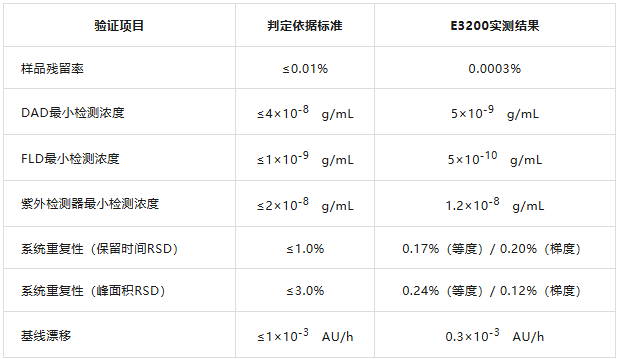 從數(shù)據(jù)可見,E3200 HPLC在各項關(guān)鍵指標(biāo)上均優(yōu)于標(biāo)準(zhǔn)要求,尤其在最小檢測濃度、殘留率等核心性能上表現(xiàn)突出。
