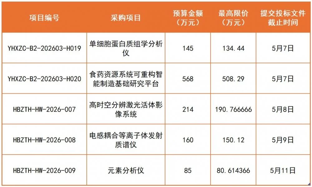 近日,武漢輕工大學(xué)生科院大型儀器設(shè)備平臺(tái)設(shè)備更新項(xiàng)目項(xiàng)目已正式啟動(dòng)公開招標(biāo)。本次采購(gòu)涵蓋單細(xì)胞蛋白質(zhì)組學(xué)分析儀、食藥資源系統(tǒng)可重構(gòu)智能制造基礎(chǔ)研究平臺(tái)、高時(shí)空分辨激光活體影像系統(tǒng)、電感耦合等離子體發(fā)射質(zhì)譜儀及元素分析儀等多套高端科研設(shè)備,整體預(yù)算金額達(dá)1172萬元,項(xiàng)目最早投標(biāo)截止時(shí)間為5月7日。